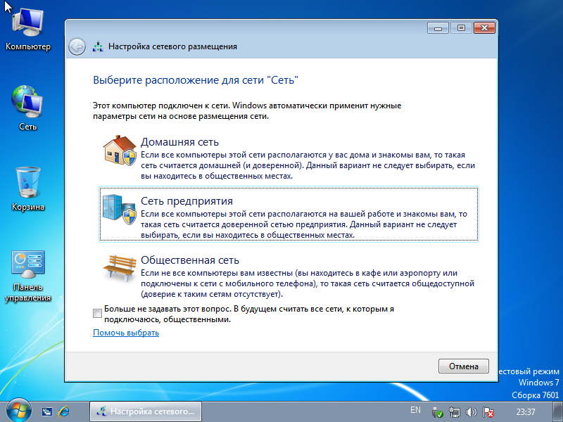 Подключить компьютер к Интернету. Вставить сетевой кабель и, при необходимости, настроить IP адреса. При появлении всплывающего сообщения, выбрать Сеть предприятия: