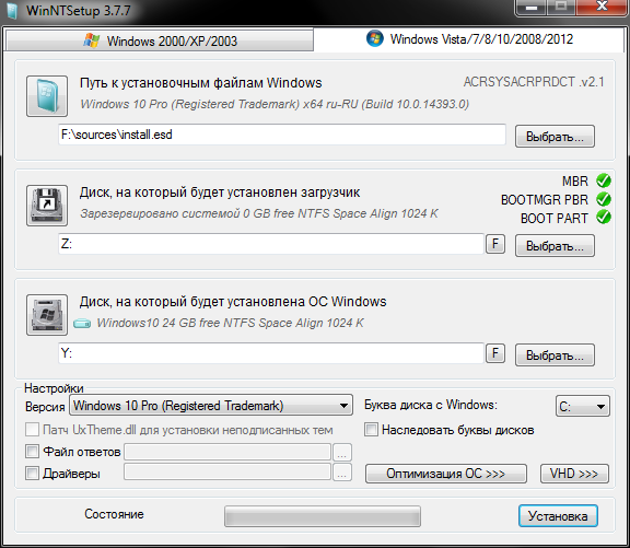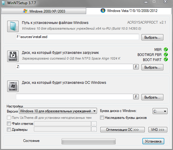 Выбрать "фиксированный размер", разметить файл. Выбрать нужную редакцию Windows, нажать "Установка"
