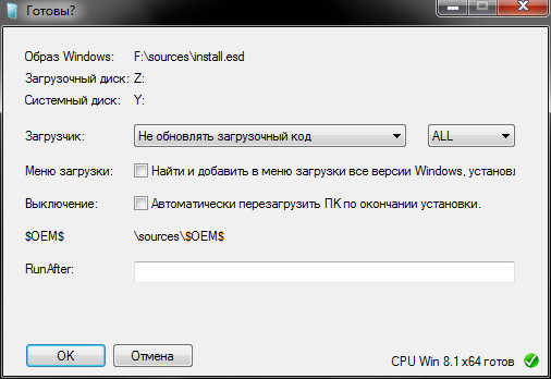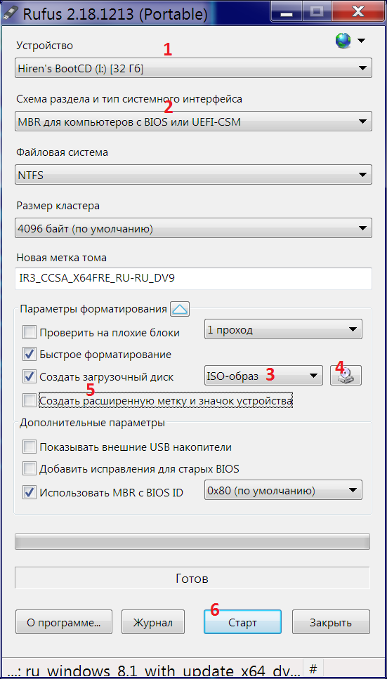 Выбрать диск, выбрать желаемую схему: BIOS или UEFI (x86 версия поддерживает только BIOS), выбрать ISO образ, отменить создание расширенной метки, запустить процесс
