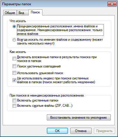 Панель управления - Параметры папок - Поиск. Настроить в соответствии со скриншотом: