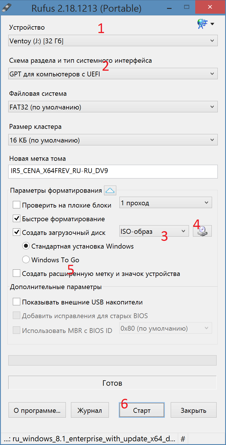 Выбрать диск, выбрать схему: "GPT для компьютеров с UEFI", выбрать ISO образ, отменить создание расширенной метки, запустить процесс